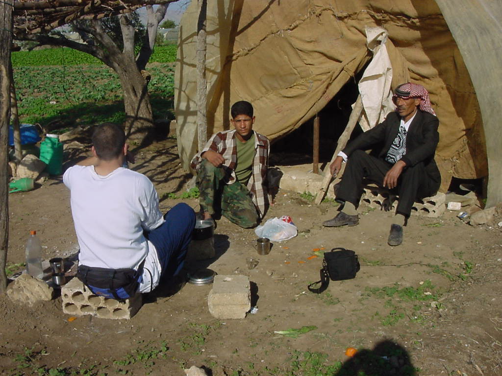 (354) Our first warm day! In the evening the day before we got over the mountain that seperated us from warmth, coming down we felt the temperature rise. We slept in a field and the next morning were invited for a tea by the owner of the land. In the background you see Israel by the way.